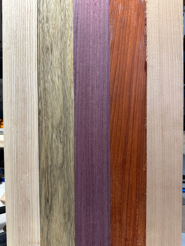 We use walnut, ambrosia maple, ash, basswood, mahogany, hard maple, flame, quilted maple, and knotty pine here.