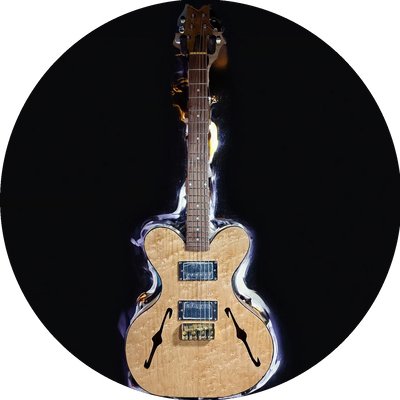 These are through-neck hollow bodies. that can be swapped right to left. The body is made of Ambrosia Maple sides. The back is made of Cuban mahogany, and the soundboard is constructed from birdseye maple. She is equipped with a low-profile bridge, two Parsons Street Humbuckers. This is a 2-inch hollow body construction made with hand-bent sides, and hand-carved sound holes and neck. We made her sound like the bluegrass of the days of olde. She is light and bright and just plan fun to play