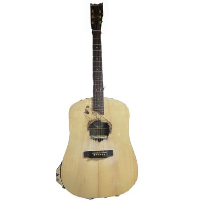 This is a thinner acoustic guitar, and it can be set up lefty or righty very easily. They are hand-carved. Wolf-themed, of course. The best part is that these are wired with both an acoustic pickup and an electric pickup. You can toggle back and forth. Now you can play the man who sold the world with one guitar!